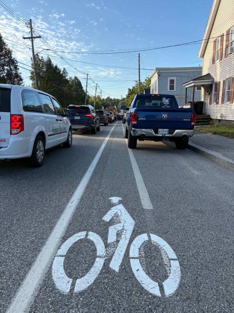 Heading out of Lewiston there was a bike lane. I could hear someone say “I told you I could fit in a bike lane.” Really, look at it, the parked truck’s mirror is halfway across the bike lane and the stencil that designates the bike lane didn’t even fit.