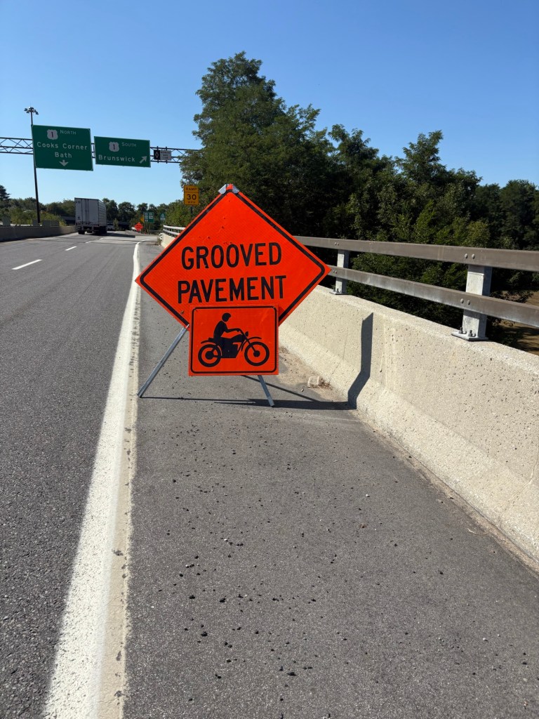 East Coast Greenway and USBR 1 signs Crossing the bridge from Topsham to Brunswick on a busy road, I found the shoulder completely taken up by a construction sign. They could have put the sign a little farther down the road just past the turn off to the bike path along the river. I called the Brunswick Police Department and they sounded like they cared and were going to do something about it.
