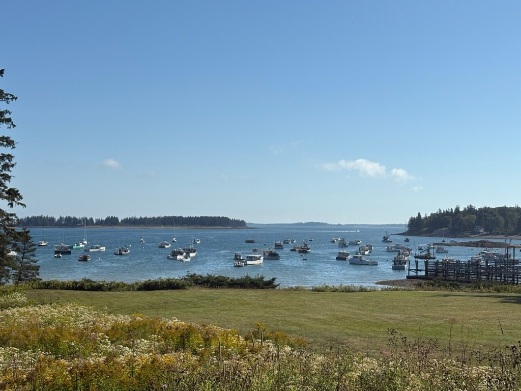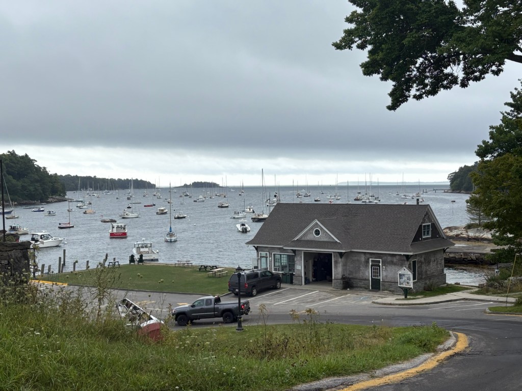Owl’s Head Harbor I rode the six miles to Rockland, Maine. It was a nice coastal Maine community. Then I climbed out of town to Ron and Denise’s house. They were my Warmshowers hosts for the night. Ron was just finishing mowing the grass and showed me where to park my bike and the outdoor shower.