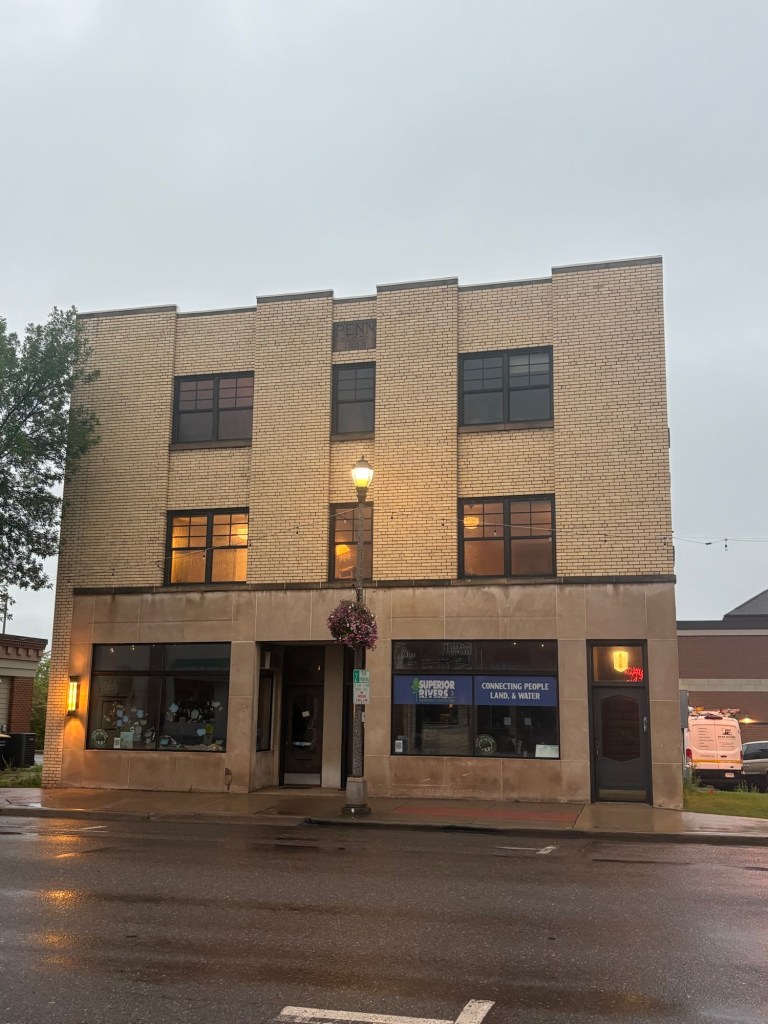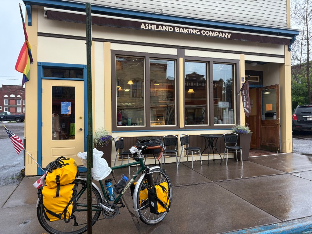 Looked bright ahead of me I had enough time to stop by the Ashland Baking Company and relocate to the Chequamwgon food Co-op before the storm hit. They had a nice bench out front with a 6 foot roof overhanging the sidewalk. I thought it would be plenty to keep me dry while I ate my lunch but the wind driven rain found me.