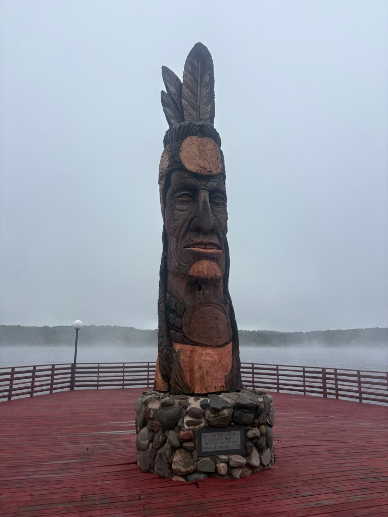 “Nee-gaw-nee-gaw-bow” Peter Wolf Toth Lake Sunday, Wakefield, Michigan Mist coming off Sunday Lake The temperature was cold enough there was fog blowing off the lake. And that night it got down to 47 degrees. I was having trouble falling asleep because I had sent home my winter sleeping bag and only had clothes and a sleeping bag liner to sleep in. Eventually I remembered I had a Tyvek ground cloth and thought if I wrapped up in it, it might trap enough heat for me to be able to get some sleep. It took an hour to warm up enough to sleep but it worked.