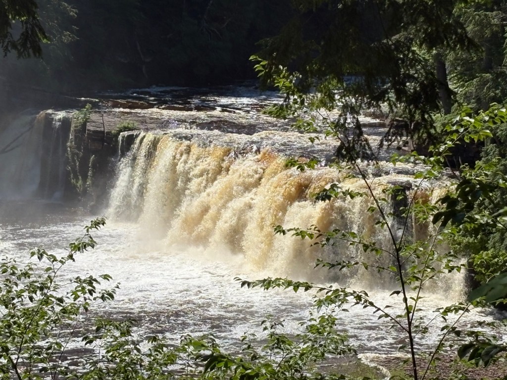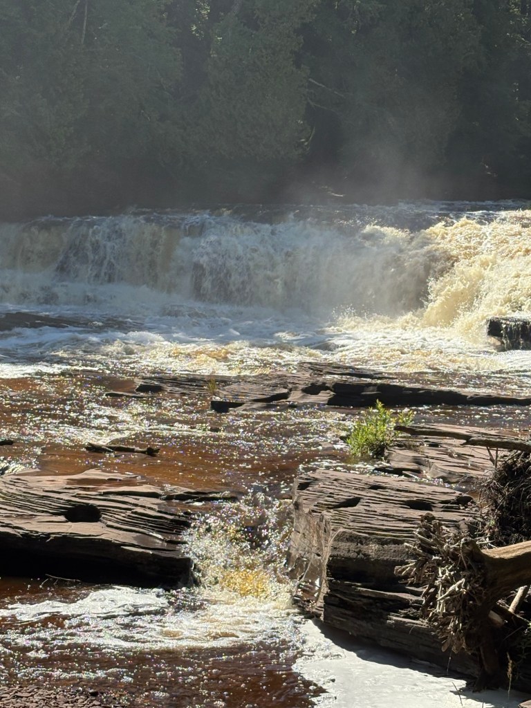 I broke camp and had decided to take the advice of a woman I was talking to in Ironwood yesterday, her advice was to go (out of my way) to the Porcupine Wilderness State park. She had just hiked and camped there and said it was fabulous. I called the park office before I left because online there was mention of the road through the park being washed out a year ago. The road was good. Then I asked the ranger on the phone what I should try to see coming through the park on a bike. She said the Presque Isle River waterfall hike was a short hike and offered amazing views of many waterfalls. So that’s what I did. The falls were amazing and fairly close together giving me a high enjoyment/time off the bike ratio. Which is what you want on a bike tour.