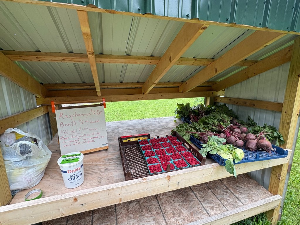 Sand Hill Crane I love a good farm stand, so when I saw one, I stopped and three young boys ran out to attend to me. We had a nice conversation and then their grandmother came out also. I bought a kohlrabi and a box of raspberries. I think it was a half pint box and I polished it off while standing there talking, raspberries don’t travel well on a bike tour anyway. I mentioned that I was sorry I couldn’t get a bunch of beets because it would be too many. And then the grandmother said she had some beets she boiled and she would be happy to send one with me. Her husband and son showed up and I tarried in conversation some more.