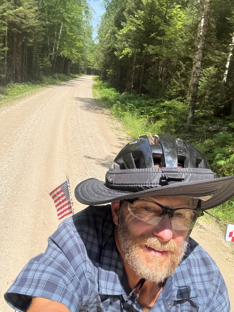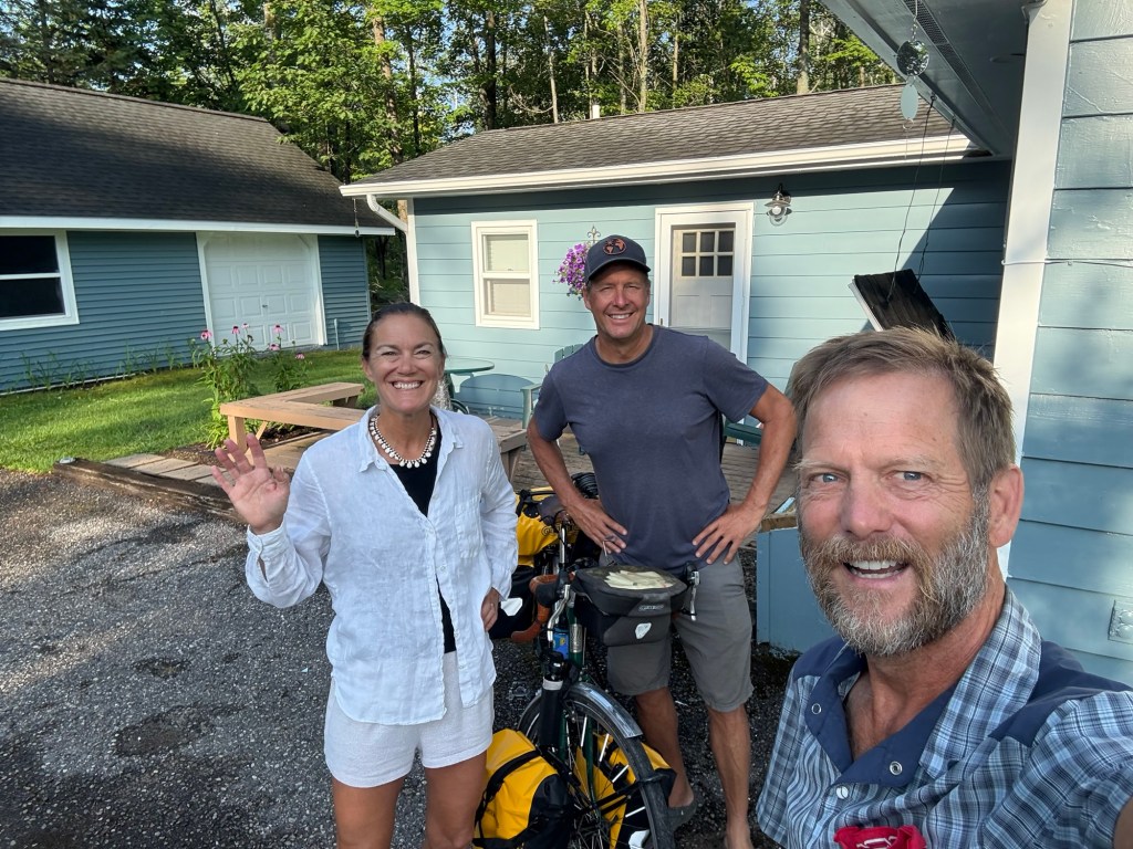 A bicycle luggage porter I took another ferry from the island to Mackinac City on the lower peninsula of Michigan. Then I still had to ride 20 miles to get to Jen and Doug’s, my Warm Showers hosts for the night. They were terrific. We watched a bit of the Tour de France and Doug told me he knew one of the riders, Matteo Jorgenson. Jen and Doug split their time between their place on Douglas Lake in Michigan and Boise, Idaho. Jen made a wonderful dinner that included a salad from her garden. It was wonderful staying with them. They sent me off in the morning with snacks for the road and some good recommendations for my route. Thank you Jen and Doug, my stay with you was marvelous.