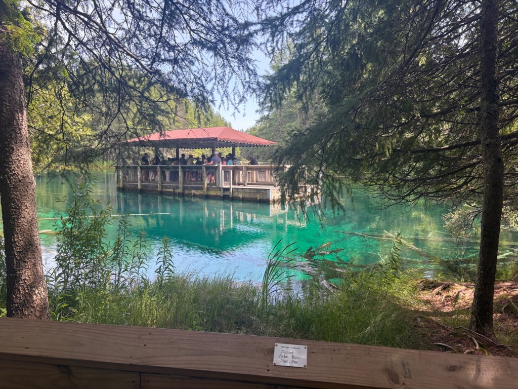 Riding some stellar gravel roads in Hiawatha N.F. Kitch-iti-Kipi is Michigan’s largest natural spring, 10,000 gallons of water a minute flow from it. It forms a lake of crystal clear water 40 feet deep that you can see all the way clear to the bottom. There is a “boat” (really a floating platform that travels along a cable) you can take out to see the spring. It’s free, I had to wait in line, but it was worth it.