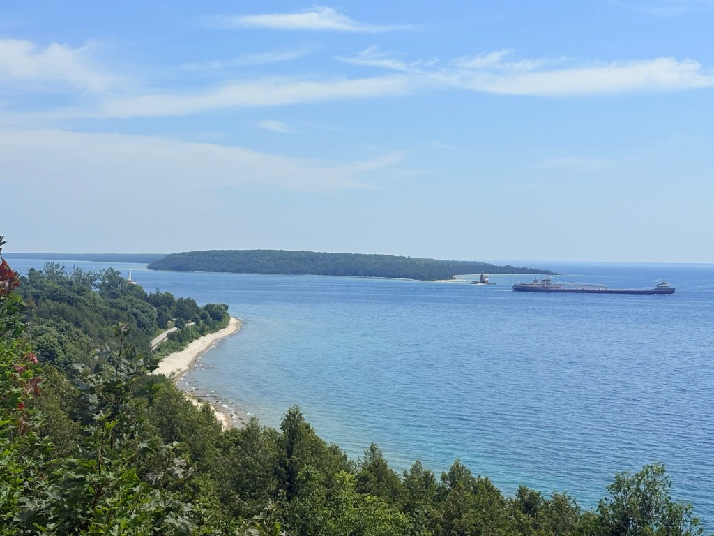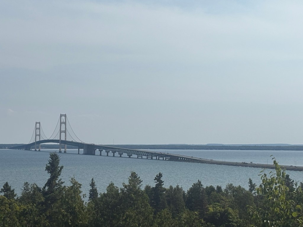 I finally came into view of the Mackinac Bridge that connects the Upper Peninsula of Michigan with the lower Peninsula of Michigan. It really is a spectacular engineering marvel but I won’t be going across it tomorrow even though it only costs $4 to get a ride across with my bike (good job Michigan). Instead I will be taking two ferries one to Mackinac Island from the Upper peninsula and one from the island to the lower peninsula.