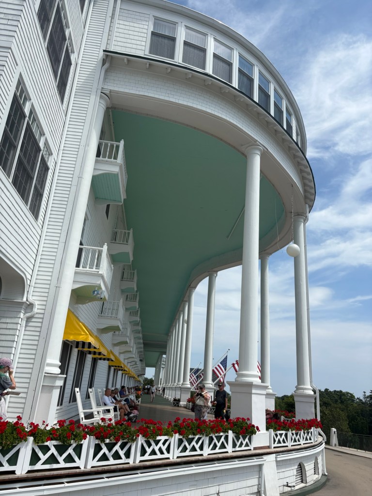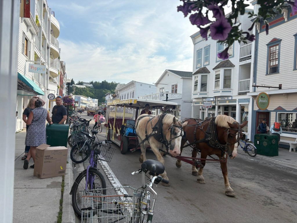 I got up early so I could get to the dock in St. Ignus to catch the first ferry to Mackinac Island (pronounced “MACK-in-awe“). I almost missed it, the ferry company has a “slow ferry” and a “fast ferry” and they leave from different docks. The first ferry to the island is the fast ferry and I was at the slow ferry dock. Luckily I figured out my error and got to the other dock in time. The ferry was fast! Most of the passengers were workers who commuted to the island for work. Many of them were on bikes and e-bikes and would ride them to their jobs on the island.