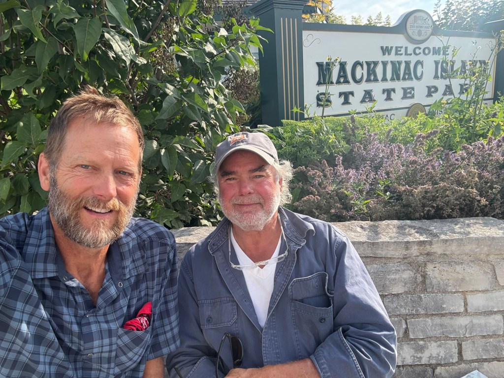 Mackinac Island, Mackinac Island I picked up a map of the island and was astride my bike studying it when a guy asked me if I wanted some local insider information. I said sure and that is how I met a wonderful human named Matt. Matt is a construction contractor on the island and today was his 65th birthday. He is wrapping up work for his customers and will retire when he is done. He has lived on the island year round for a number of years and gave me his recommendations of what I should see while I was on the island. He told me about the best place to swim and told me about a couple chairs he had on the beach that I could use while eating my lunch. Then he said he was going to get a breakfast sandwich across the street and asked “can I get one for you?” We walked across the street, the place was packed but he knew the people and managed to order a couple sandwiches to go. We ate our sandwiches on a bench and had a great conversation about life and the world. He told me a little about what Mackinac Island is like to live on in the winter. Apparently people ride snowmobiles across the ice to the mainland but the ice can crack and pile up making the trip very dangerous. Thanks Matt for your time on your birthday and all that you shared with me.